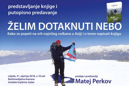 U sklopu predavanja bit će predstavljena i nova Matejeva knjiga „Želim dotaknuti nebo“. U svojoj bogato opremljenoj knjizi na 300-injak stranica autor se potrudio ispričati svoje viđenje planinske romantike. Uz opise svojih uspona Matej Perkov također samokritički sagledava svoje odluke, razmišljajući o emocionalnom i duhovnom spajanju s planinom. Ljubitelji putopisa s tematikom planinarstva i outdoor sportova uživat će u ovom štivu koje će ih ponukati da razmisle o svemu onom što će ih obogatiti svaki put kada odluče svoje vrijeme provesti u prirodi.