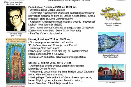 kategorija: OpćenitoOrganizator: Društvo zadarskih ArbanasaLokacija: Ogranak Arbanasidatum/vrijeme: Utorak, Svibanj 8, 2018 - 19:00 to 21:00datoteka: plakat Dani Gospe Loretske 2018.jpg