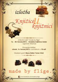 Izložba unikatnog nakita Knjižice u knjižnici "made by flige." bit će postavljena u Gradskoj knjižnici Zadar, Ogranku Arbanasi povodom manifestacije Zadar čita 2013. Za glazbeni dio prilikom otvorenja16. 4. 2013. u 18:00 sati pobrinut će se Elena Stella i Tome Vrkić, dvojac iz benda Dirty Harry. Knjižice u knjižnici možete razgledati u radno vrijeme Ogranka Arbanasi od 16. - 30. travnja 2013.