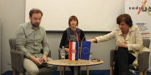 Fotografije sa sinoćnje tribine Osuđeni na suradnju u sklopu projekta ZadrugArt na kojoj su gostovali Teodor Celakoski iz Zagreba i Tamara Visković iz Splita, uz moderiranje Maje Milin.