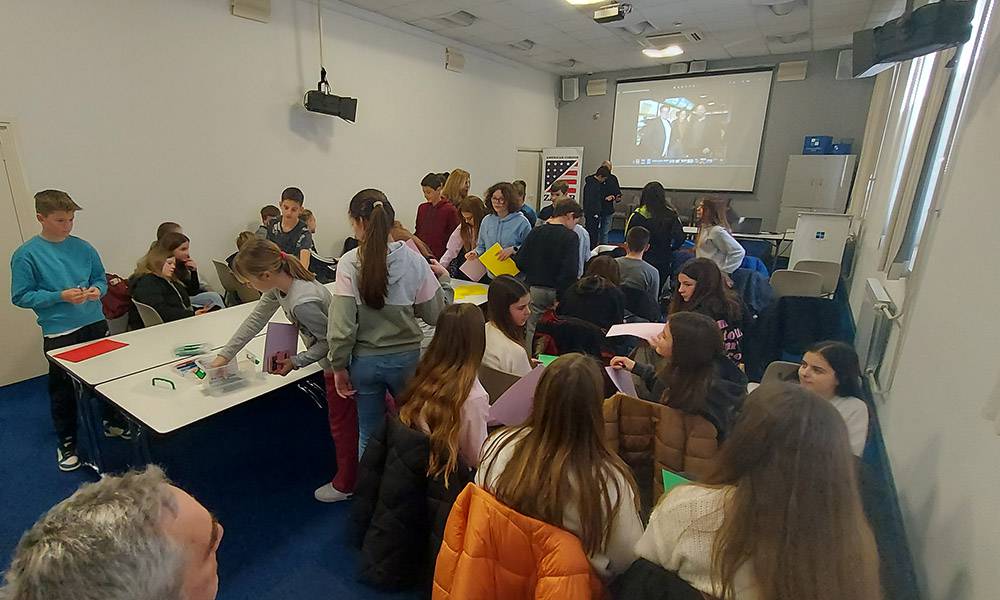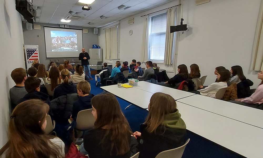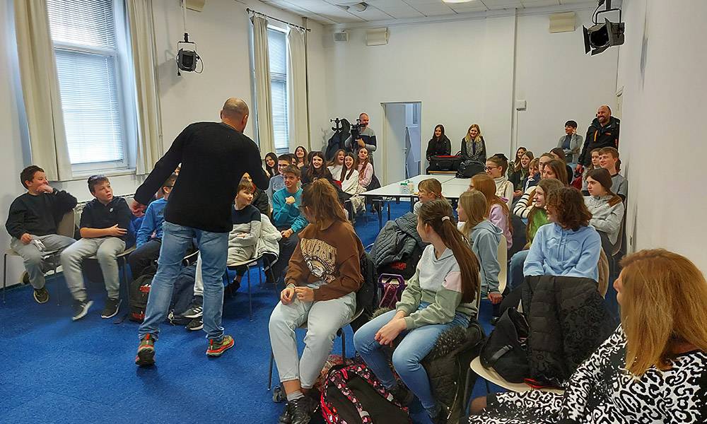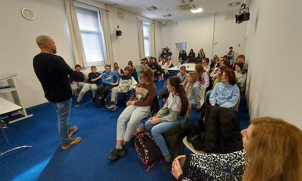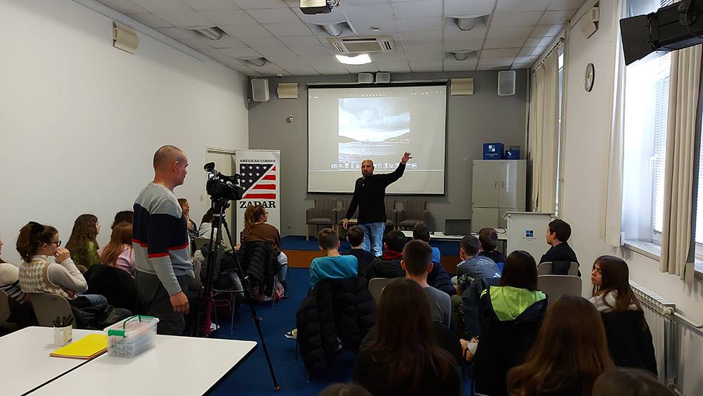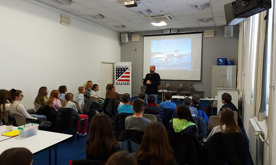 Geography professor Domagoj Jakopović Ribafish with children in American Corner Zadar. Ribafish is an eternal boy, traveler, entertainer and lover of the world around us. In 2018, he lost his son. A year later he started the RokOtok project. The same named book tells about their conversations, travels and love.