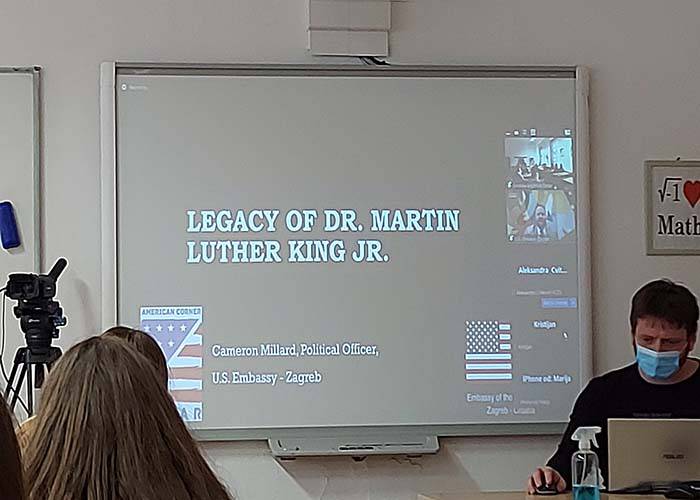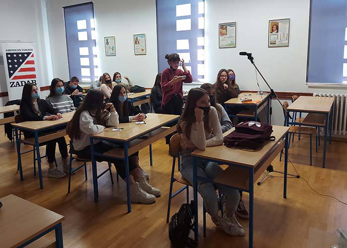 ZOOM predavanje na engleskom jeziku za učenike Gimnazije Vadimira Nazora u Zadru. U praćenje izlaganja uključeni su i korisnici Američkih kutaka u Zagrebu, Rijeci, Osijeku i Vukovaru. Predavač: Cameron Millard (diplomat Američkog veleposlanstva u Zagrebu)