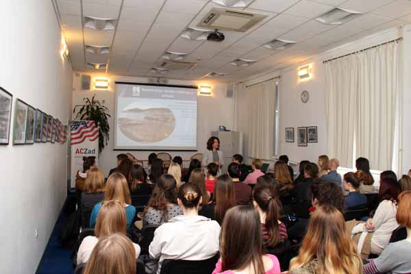 During the meeting with students from Zadar high schools Dr. Anamaria Frankic (USA, University of Massachusetts Boston) introduced them to her lectures on biomimicry, what can we learn from 3.8 billion years of life, which are the lessons that one can draw from nature, how to use them, how to patent them and how to apply the idea and make use of it in practical life. She cited a number of interesting examples: