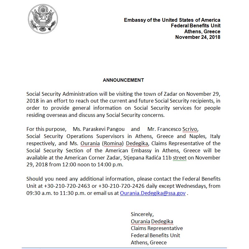 Konzularna služba (Američko veleposlanstvo Atena, Grčka) za američke građane u Američkom kutku Gradske knjižnice Zadar