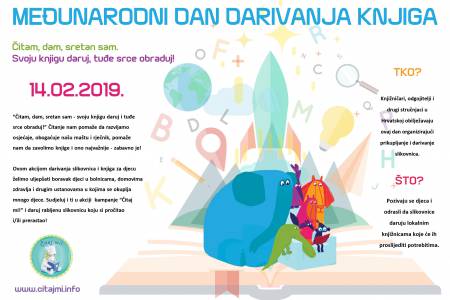 Povodom Međunarodnog dana darivanja knjiga 14. veljače, a u okviru nacionalne kampanje „Čitaj mi!“, pod geslom Čitam, dam, sretan sam - svoju knjigu daruj i tuđe srce obraduj!, Gradska knjižnica Zadar pridružuje se akciji prikupljanja slikovnica i knjiga koja će trajati od 14. veljače do 14. ožujka 2019. godine. Knjige se prikupljaju na Dječjem odjelu, u ograncima, u bibliobusu i knjižničnoj stanici Bokanjac, a bit će proslijeđene potrebitim ustanovama.