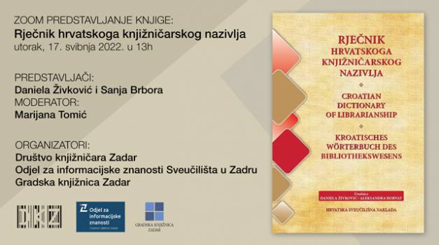 Danas je, u organizaciji Društva knjižničara Zadar, Gradske knjižnice Zadar i Odjela za informacijske znanosti Sveučilišta u Zadru predstavljena knjiga „Rječnik hrvatskoga knjižničarskog nazivlja“. O knjizi su govorile prof. dr. sc. Daniela Živković i dr. sc. Sanja Brbora, a razgovor je moderirala izv. prof. dr. sc. Marijana Tomić, pročelnica Odjela za informacijske znanosti.