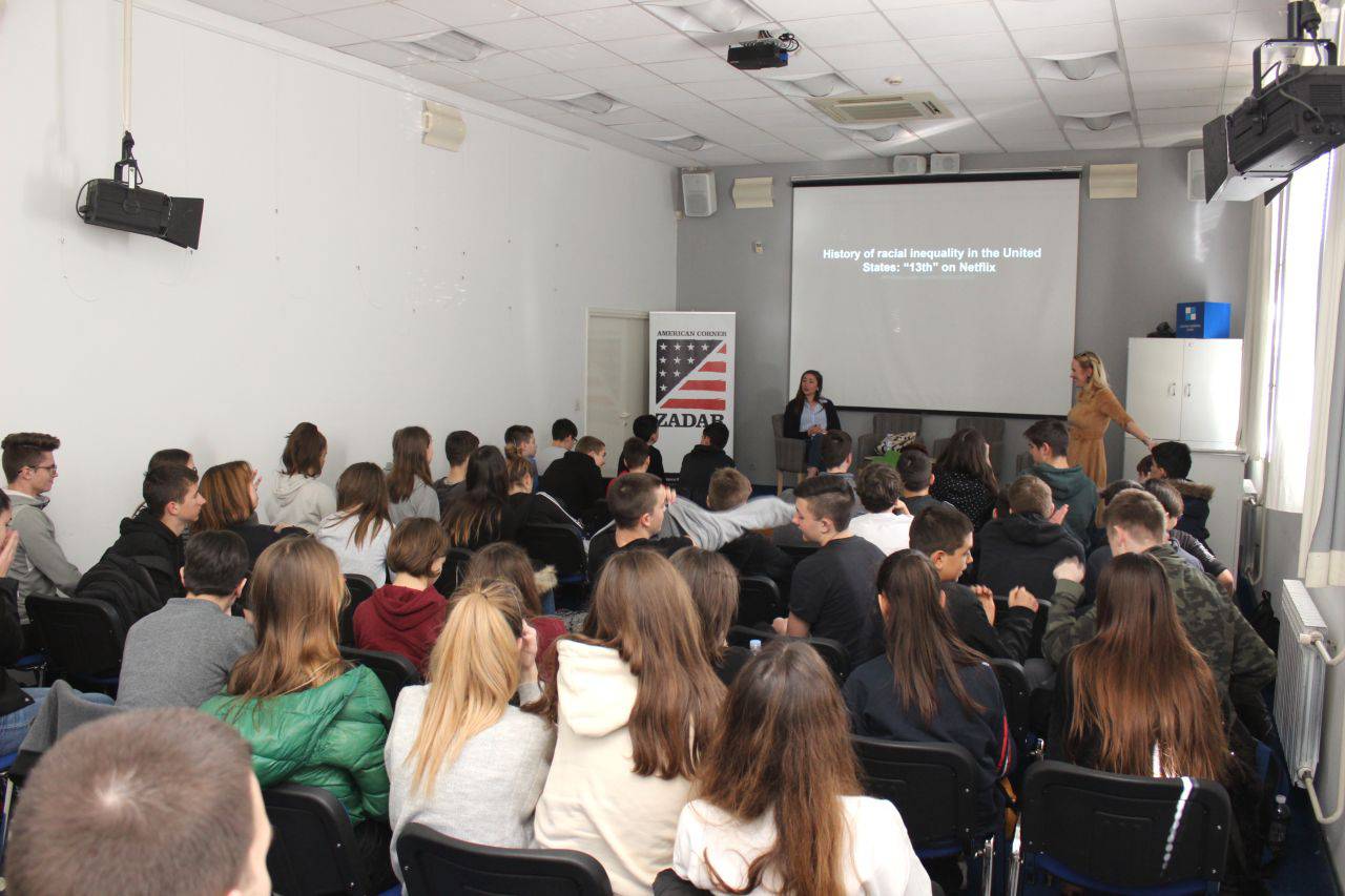 Ellie Kallgren (SAD), Fulbright stipendistica i asistentica na Odjelu za engleski jezik Sveučilišta u Zadru, održala je predavanje na engleskom jeziku za učenike 8. razreda OŠ Šimun Kožičić Benja u Zadru.