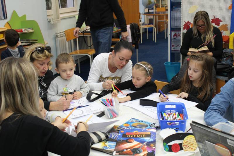 Fotografije s jučerašnje radionice Utorkom u 4. Čitali smo priču Velimira Sriće Veliko putovanje Maloga globusa, a potom izrađivali krune sa suncem i planetima, kao prave kraljice i kraljevi svemira.