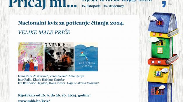 Draga djeco, pozivamo vas na sudjelovanje u Nacionalnom kvizu za poticanje čitanja 2024. Upute možete pronaći na: Dječjem odjelu ili na mrežnim stranicama kviza: https://www.mhk.hr/kviz/