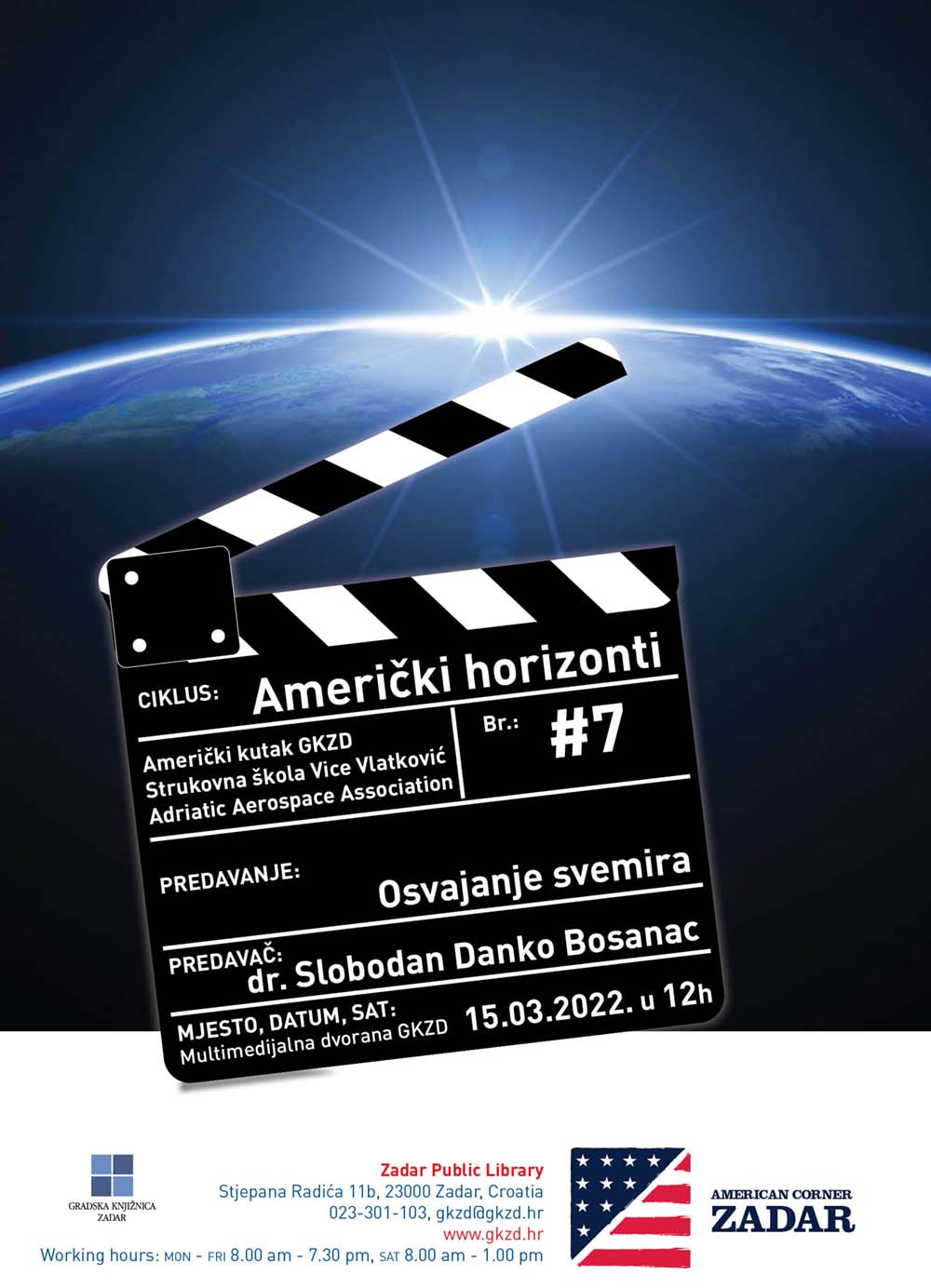 Predavanje "Osvajanje svemira" namjenjeno je učenicima tehničkih i strukovnih škola u Zadru. Gost predavač je dr. Slobodan Danko Bosanac, hrvatski fizičar na Institutu Ruđer Bošković koji se bavi atomskom, molekularnom fizikom i astrofizikom. Predsjednik je udruge Adriatic Aerospace Association koja uključuje u svoj opseg djelovanja popularizaciju znanosti i tehnologije s naglaskom na aero-svemirske teme.