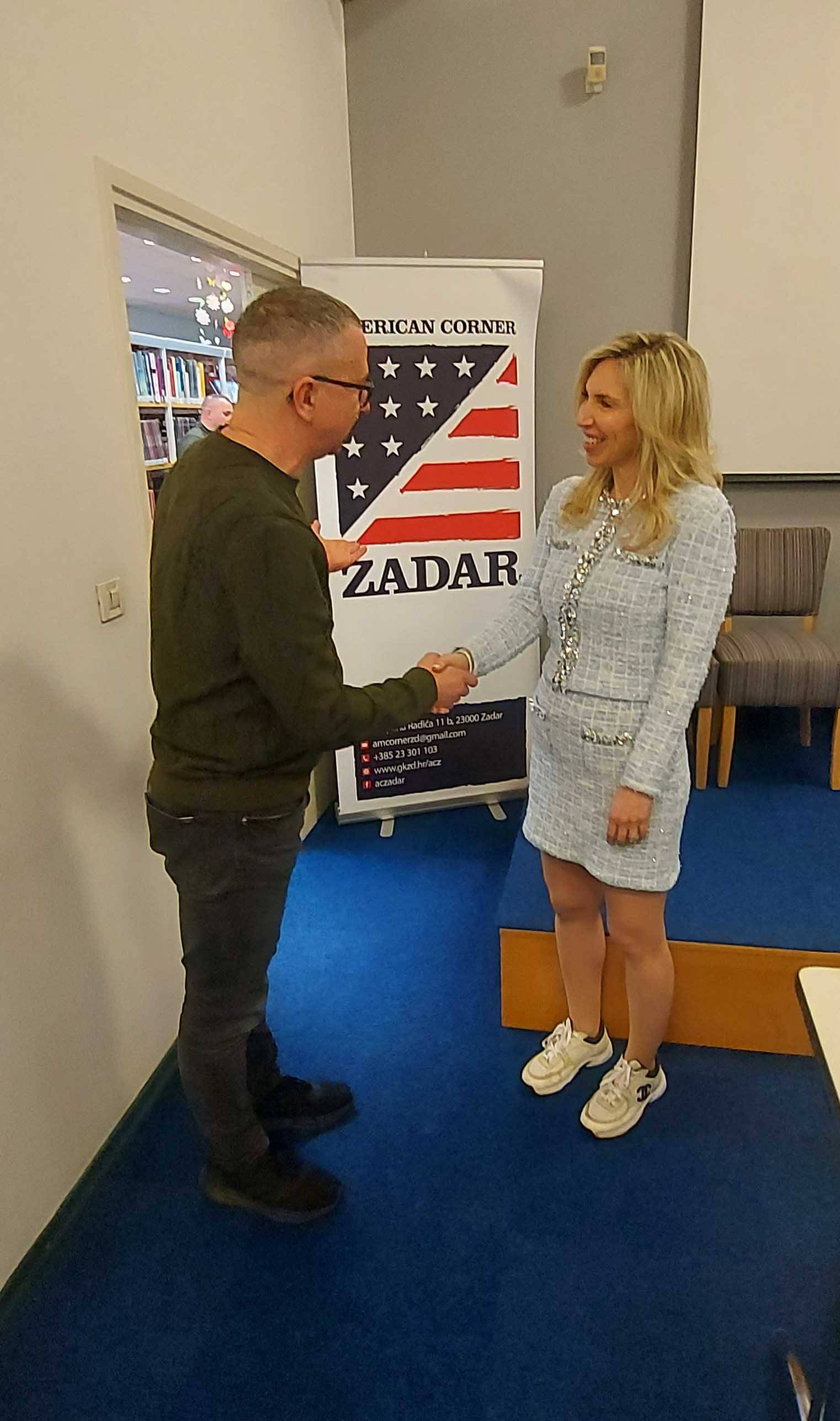 S osobitim smo poštovanjem ugostili veleposlanicu Nicole McGraw u ponedjeljak, 23. ožujka 2026., prigodom njezina prvog dolaska u Američki kutak Zadar—susreta koji je, u duhu inicijative Freedom 250, naše živuće i trajne proslave 250 godina američke neovisnosti kroz programe Američkog kutka i Veleposlanstva, podsjetio na više od dva desetljeća američkih ulaganja u naš Američki kutak, ulaganja koja su postojano i strpljivo tkala veze između hrvatskog i američkog naroda.