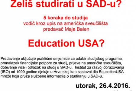 Radionicu Vodič kroz studij u SAD-u - EducationUSA o mogućnostima studiranja u SAD-u održati će Maja Balen, koordinatorica obrazovnog savjetovanja iz Instituta za razvoj obrazovanja (IRO) koji od 1999.godine djeluje kao sastavni dio EducationUSA mreže koji pruža točne, sveobuhvatne i aktualne informacije o mogućnostima studiranja u SAD-u uz potporu U.S. State Departmenta i Američkog veleposlanstva u Zagrebu.