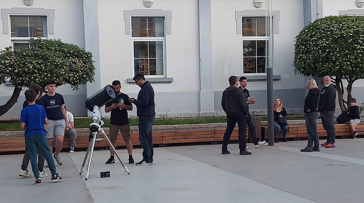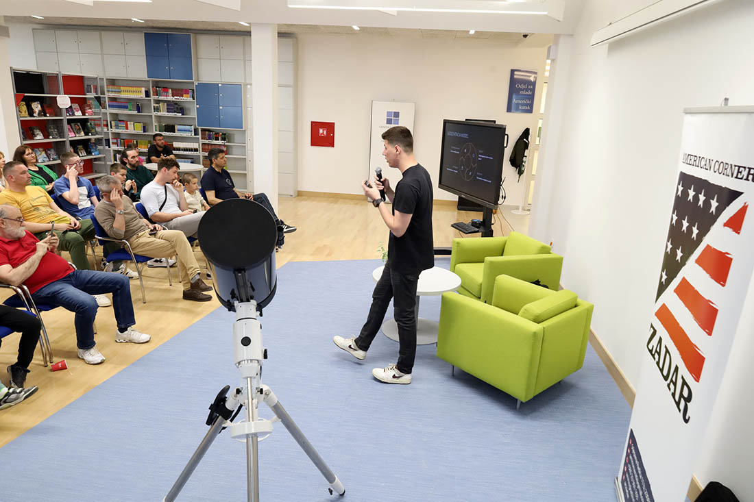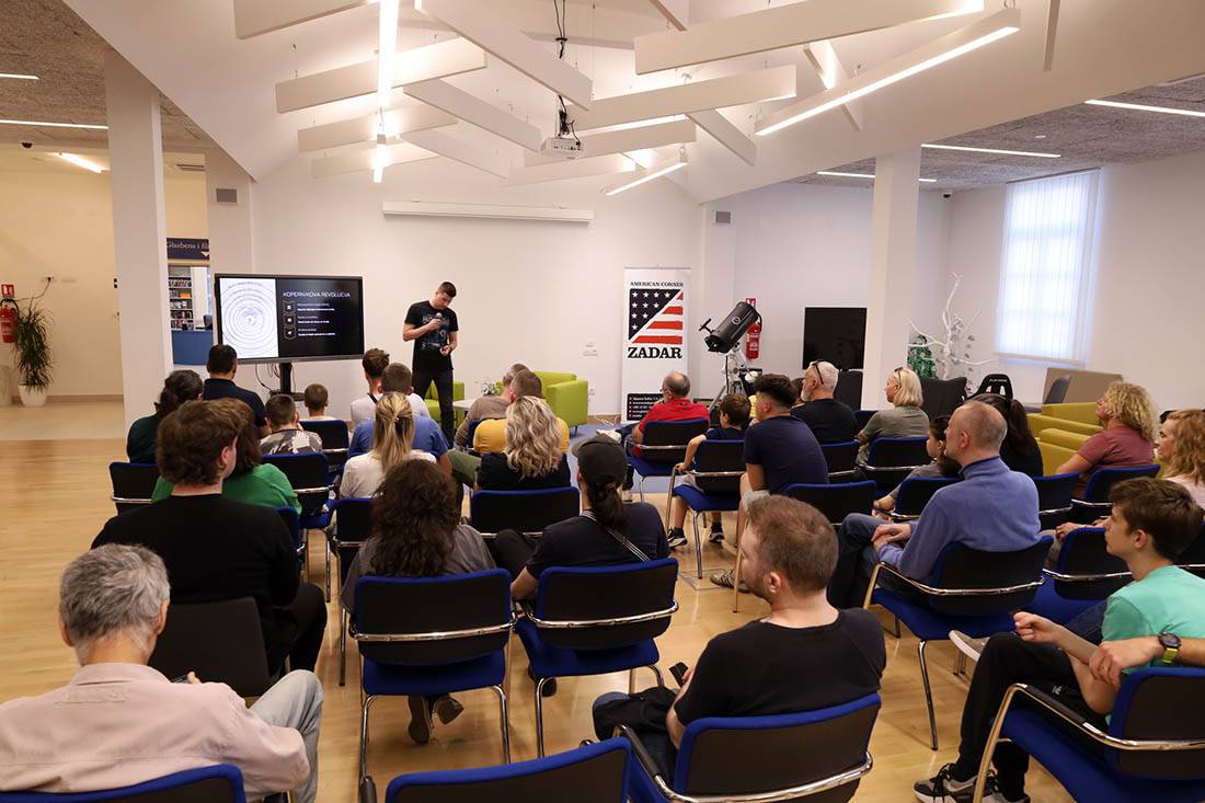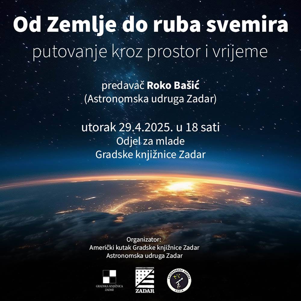 Gost predavač Roko Bašić, fizičar iz Astronomske udruge Zadar, pored povijesnog pregleda od otkrića oblika zemlje do spoznaje o veličini i starosti svemira, u svom predavanju "Od Zemlje do ruba svemira: putovanje kroz prostor i vrijeme", komentirao je i nova otkrića, te valjanost naših trenutnih kozmoloških modela.
