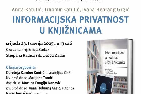 U Gradskoj knjižnici Zadar predstavit će se knjiga Informacijska privatnost u knjižnicama čiji su autori Ana Katulić, Tihomir Katulić i Ivana Hebrang Grgić.