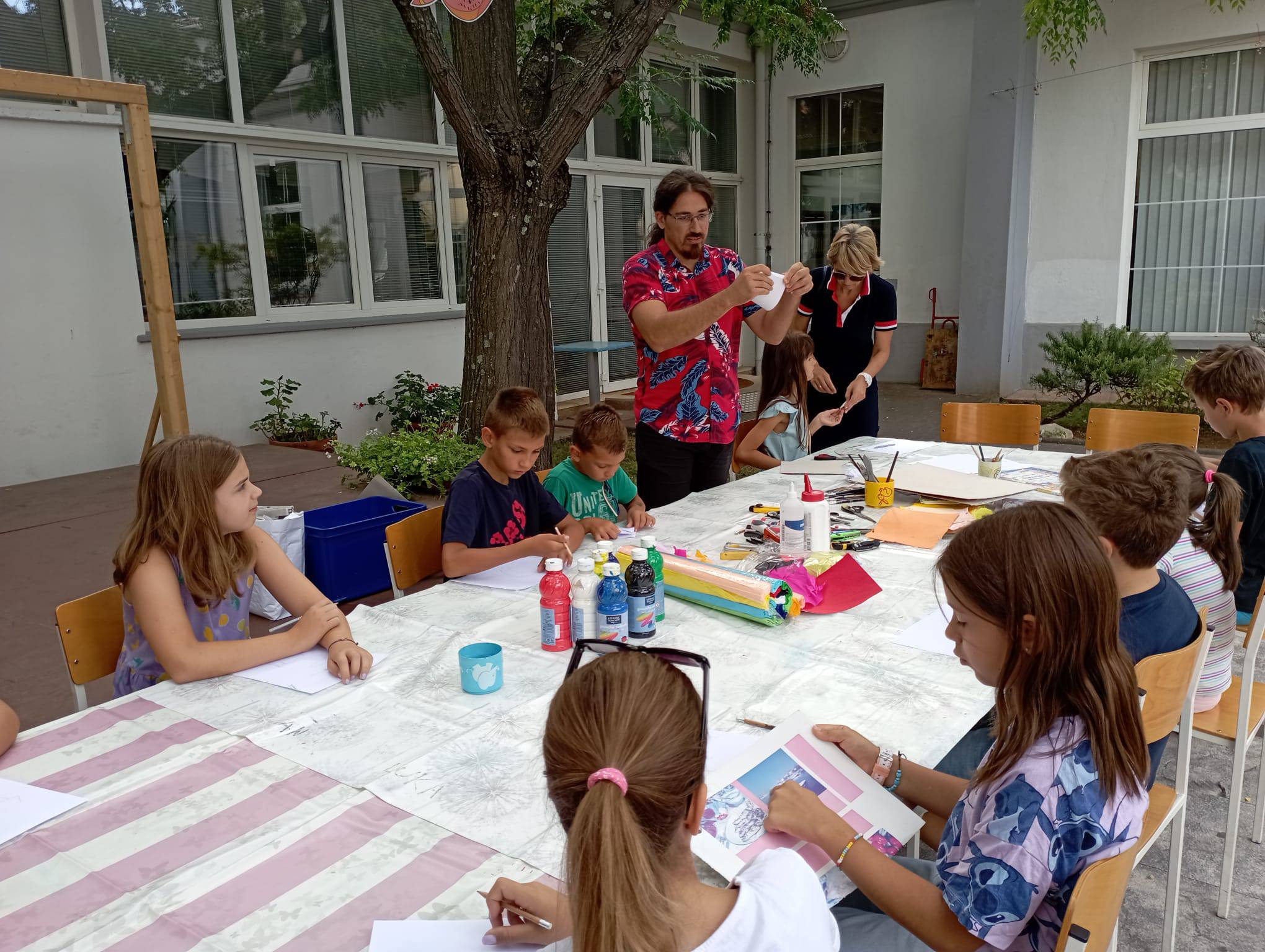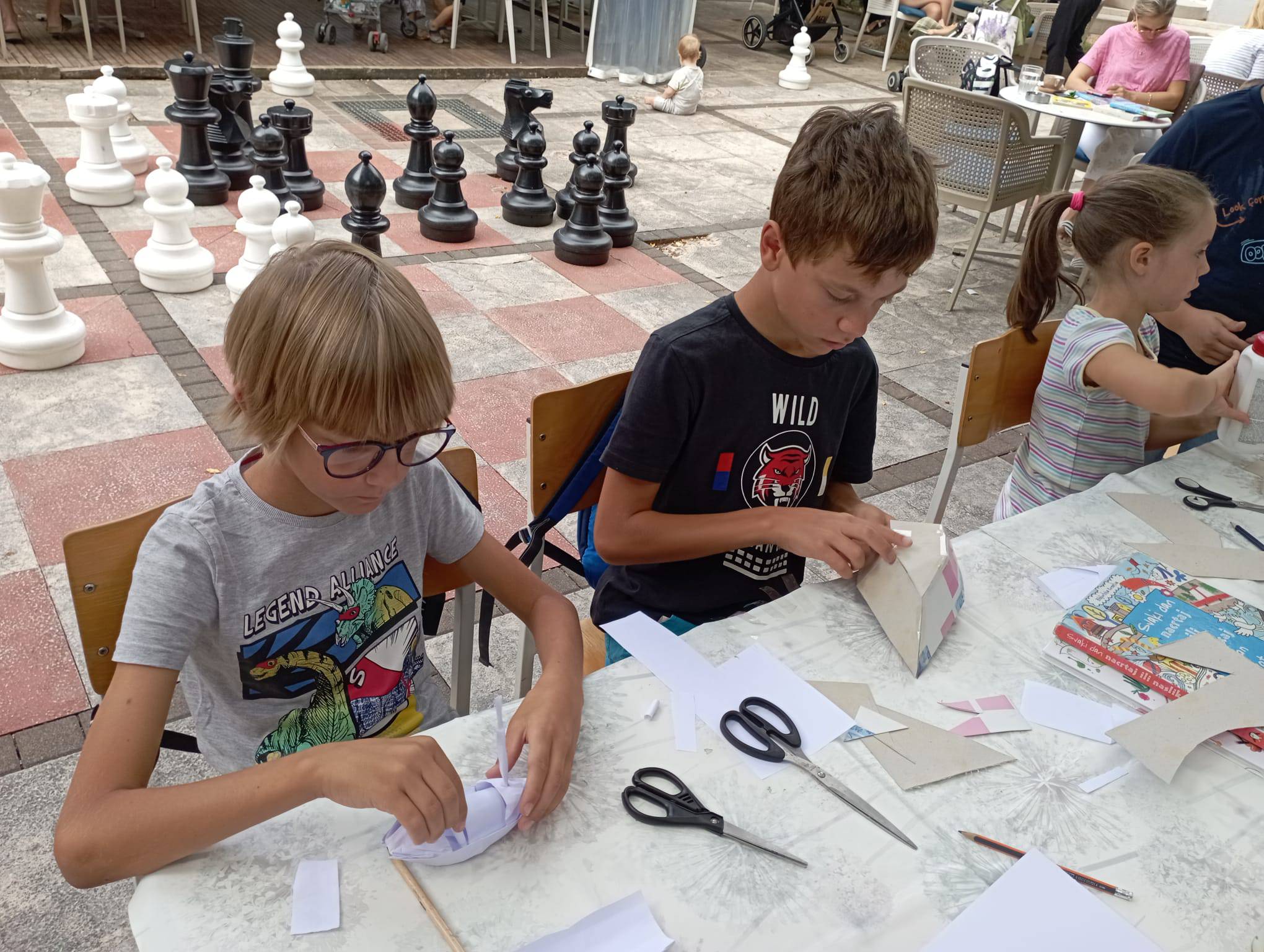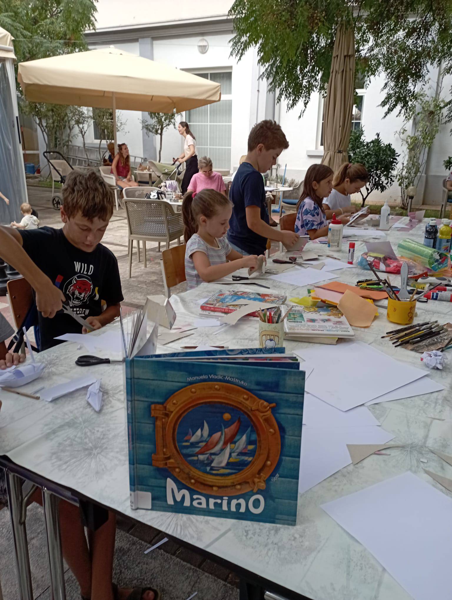 Radionica Kreativno s Dinom Colićem održala se jutros u dvorištu Središnje knjižnice. Moj brodić naziv je devete i posljednje tematske radionice s Dinom namijenjene djeci osnovnoškolske dobi. Djeca su od kartona i tvrdog papira s ljepilom i drugim pomagalima izradila vlastite brodiće. Svaki brodić imao je originalan naziv koji su izabrala djeca.