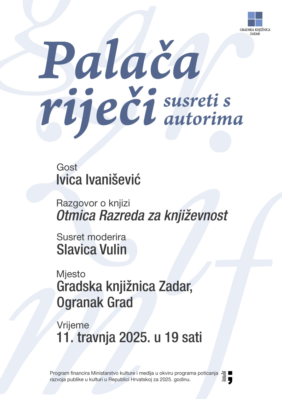 U sklopu programa Palača riječi gostuje književnik Ivica Ivanišević koji će predstaviti knjigu Otmica Razreda za književnost. Program je financiran od strane Ministarstva kulture i medija Republike Hrvatske kao program poticanja razvoja publike u kulturi za 2025. godinu.