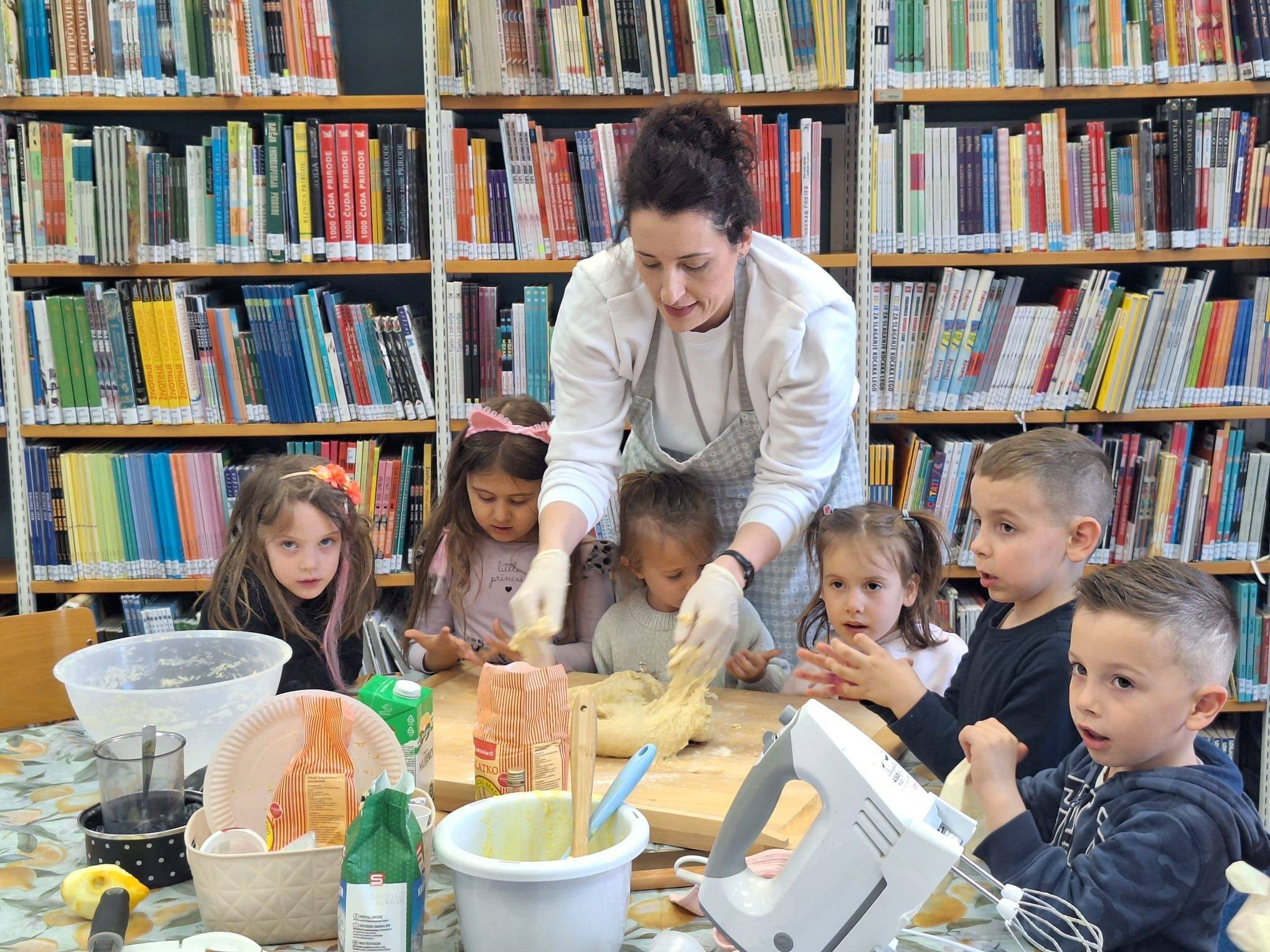 Danas smo na Dječjem odjelu ugostili mališane iz DV Sunce, PO Jazine, s kojima smo održali jednu posebno toplu i mirisnu radionicu. Nakon čitanja priče „Petra kuha“, zavrnuli smo rukave i sami se okušali u miješenju tijesta za pogače. Ruke su ubrzo bile pune brašna, ali osmijesi ni na trenutak nisu silazili s lica. Veliko hvala našim malim sudionicima na radosti koju su unijeli u današnju radionicu. Veselimo se ponovnom druženju!