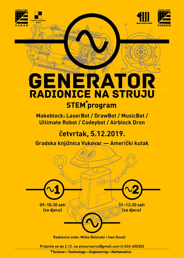 Radionica za djecu "Generator - radionice na struju" u Gradskoj knjižnici Vukovar na kojoj su pokazane mogućnosti STEM opreme koje ima Američki kutak u Zadru: robot za crtanje i glazbu, laserski graver, Codeybot robot... Program je dogovoren u suradnji Američkog kutka Gradske knjižnice Zadar (Milko Belevski i Ivan Kovač) i Američkog kutka Gradske knjižnice Vukovar.
