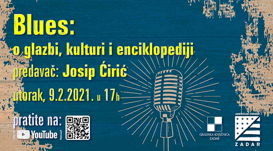 Virtualno predavanje „Blues: o glazbi, kulturi i enciklopediji“ dr. sc. Josipa Ćirića povodom mjeseca Black History Month. Organizator Američki kutak Gradske knjižnice Zadar u suradnji s Američkim kutcima u Rijeci, Zagrebu, Osijeku i Vukovaru.