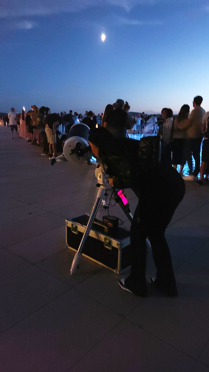 Promatranje vidljivih objekata na nebu kroz teleskope na zadarskoj rivi na Pozdravu Suncu u suradnji sa Astronomskom udrugom Zadar i Društvom knjižničara Zadar.