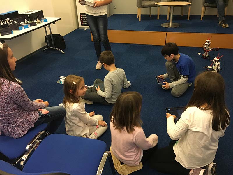 Construction of the structure, demonstration and graphic programming of robotic sets fo children: LEGO Mindstorm EV3, modular Airblock Dron and Codeybot smart robot.