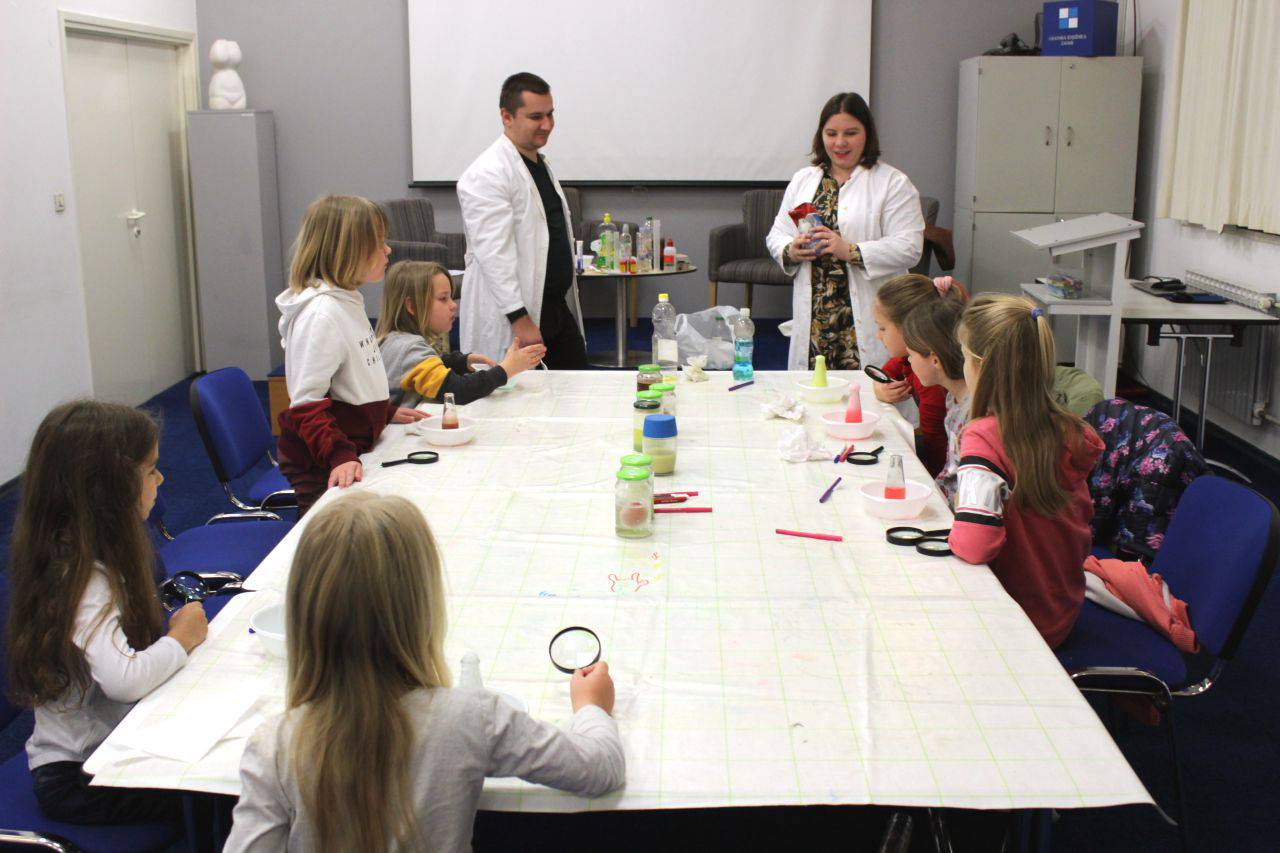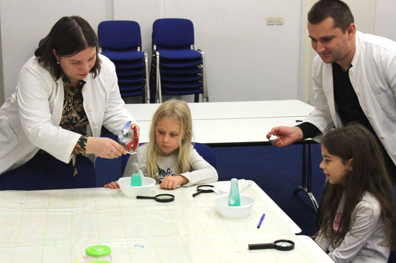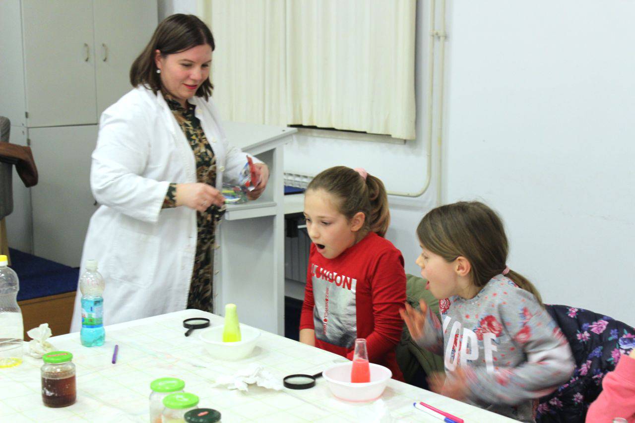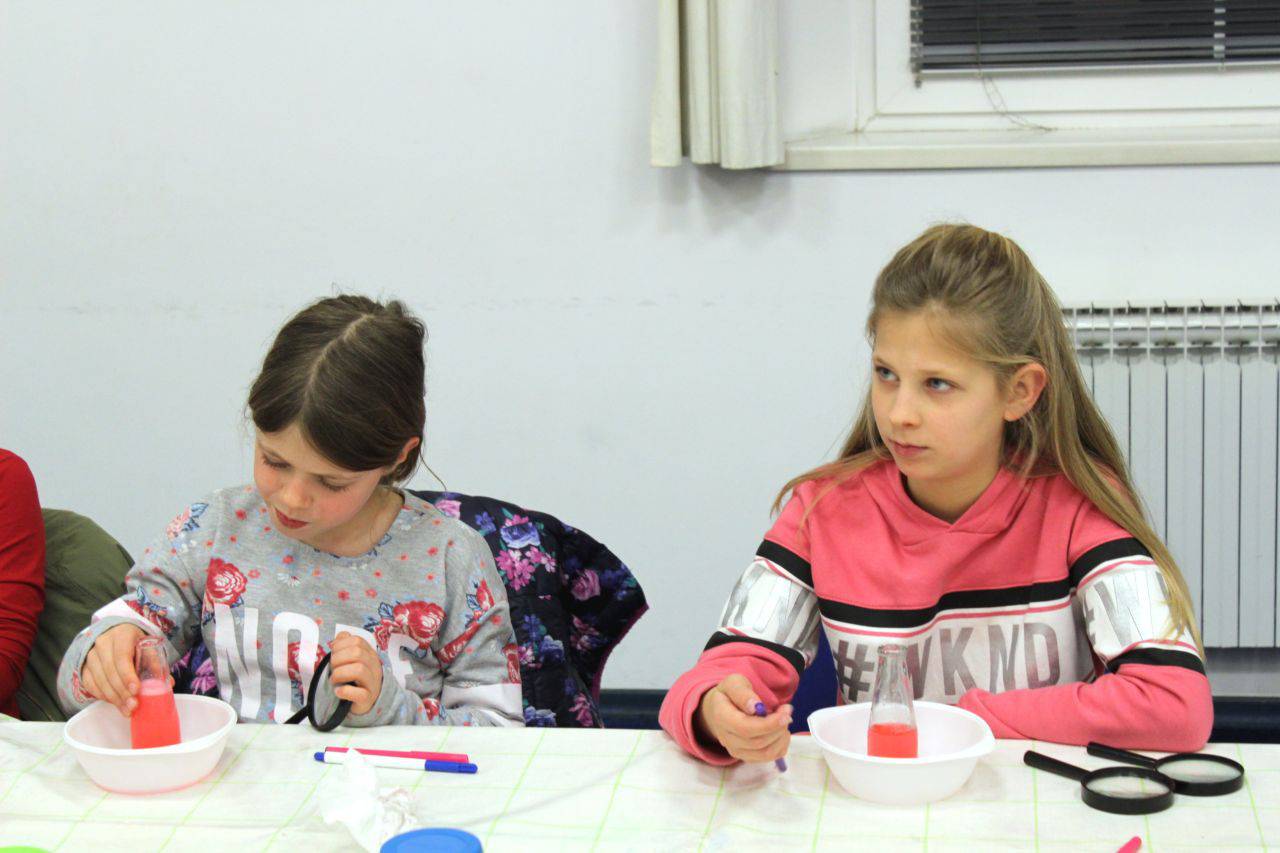 Nekoliko fotografija s radionice Mali kemičari koju su vodili prof. Andreja Kakša i prof. Matija Kakša.