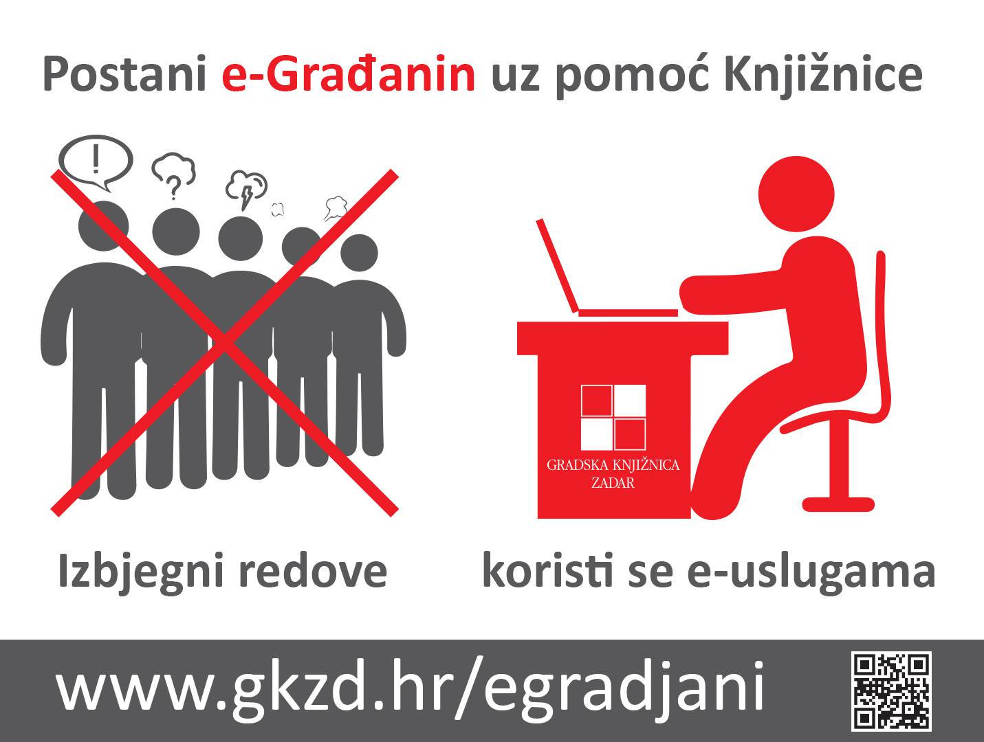 Usluga eGrađani oglašena je na mrežnoj i Facebook stranici Knjižnice te izradom plakata, letaka i video materijala. U suradnji s Općom bolnicom Zadar, Policijskom upravom Zadarskom, Zavodom za javno zdravstvo Zadar te Hrvatskim zavodom za zapošljavanje Područni ured Zadar, ovu uslugu oglasili smo plakatima i u njihovim prostorijama te im ovim putem zahvaljujemo na tome.