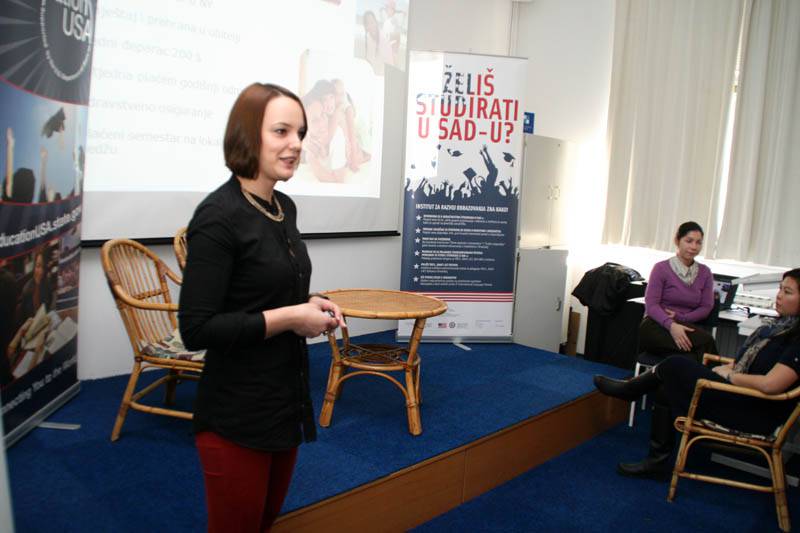 Fotografije s predavanja Sandre Dobrić, obrazovne savjetnice EducationUSA mreže u Institutu za razvoj obrazovanja o mogućnostima strudiranja u SAD-u.
