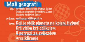 Program Mali geografi nastao je kao zajednička inicijativa Hrvatskog geografskog društva – Zadar, Odjela za geografiju Sveučilišta u Zadru i Gradske knjižnice Zadar. Cilj programa Mali geografi je predstaviti široj javnosti geografiju kao jedan od predmeta poučavanja u osnovnoj školi koji nudi niz zanimljivih tema o kojima će učenici steći nove spoznaje. Radionice će se odvijati u prostorima Gradske knjižnice Zadar, a namijenjene su učenicima nižih razreda osnovne škole.