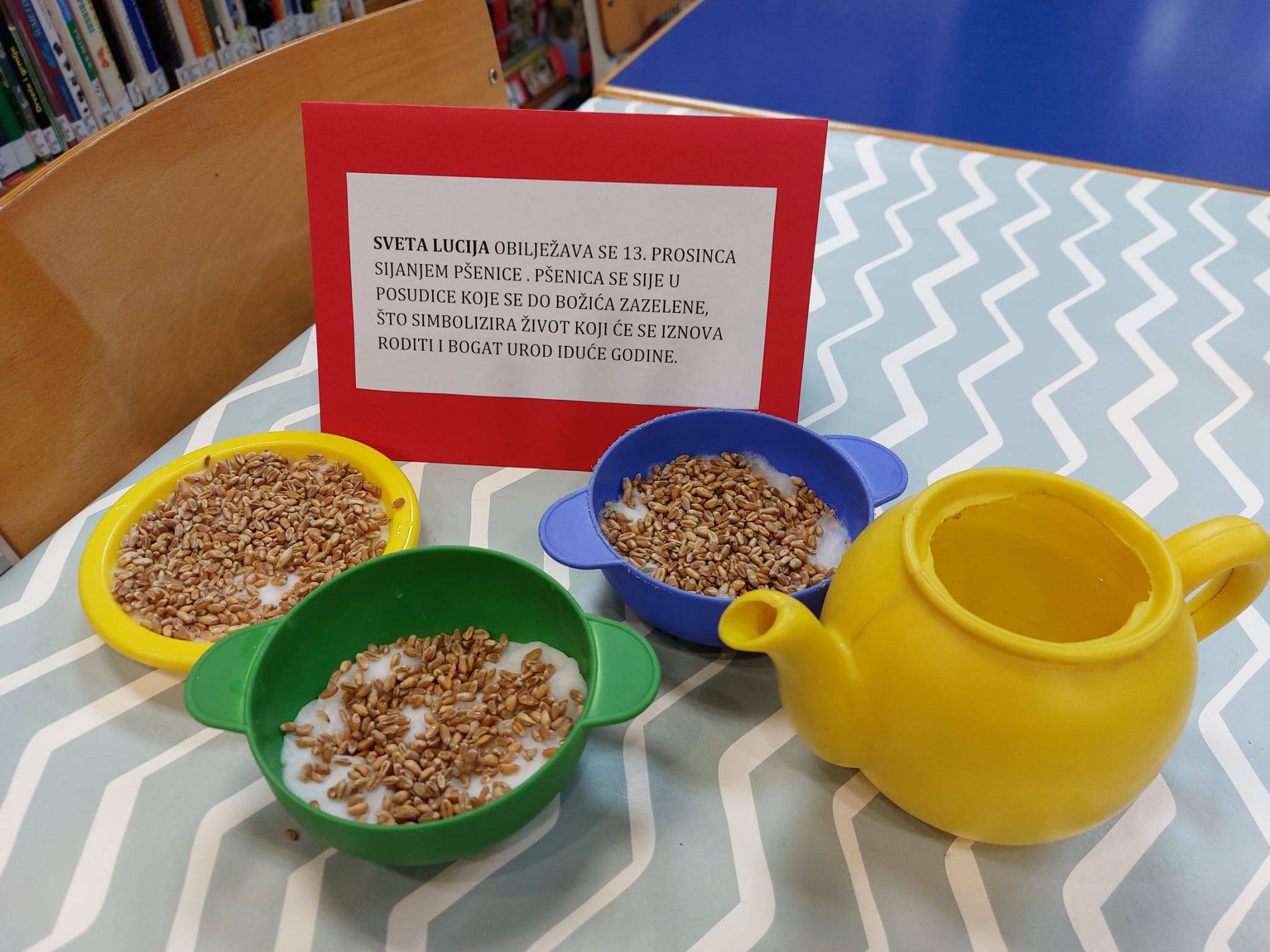 U blagdanskom ozračju, danas smo na svim lokacijama Knjižnice, povodom blagdana svete Lucije prema tradicionalnom običaju posijali pšenicu.