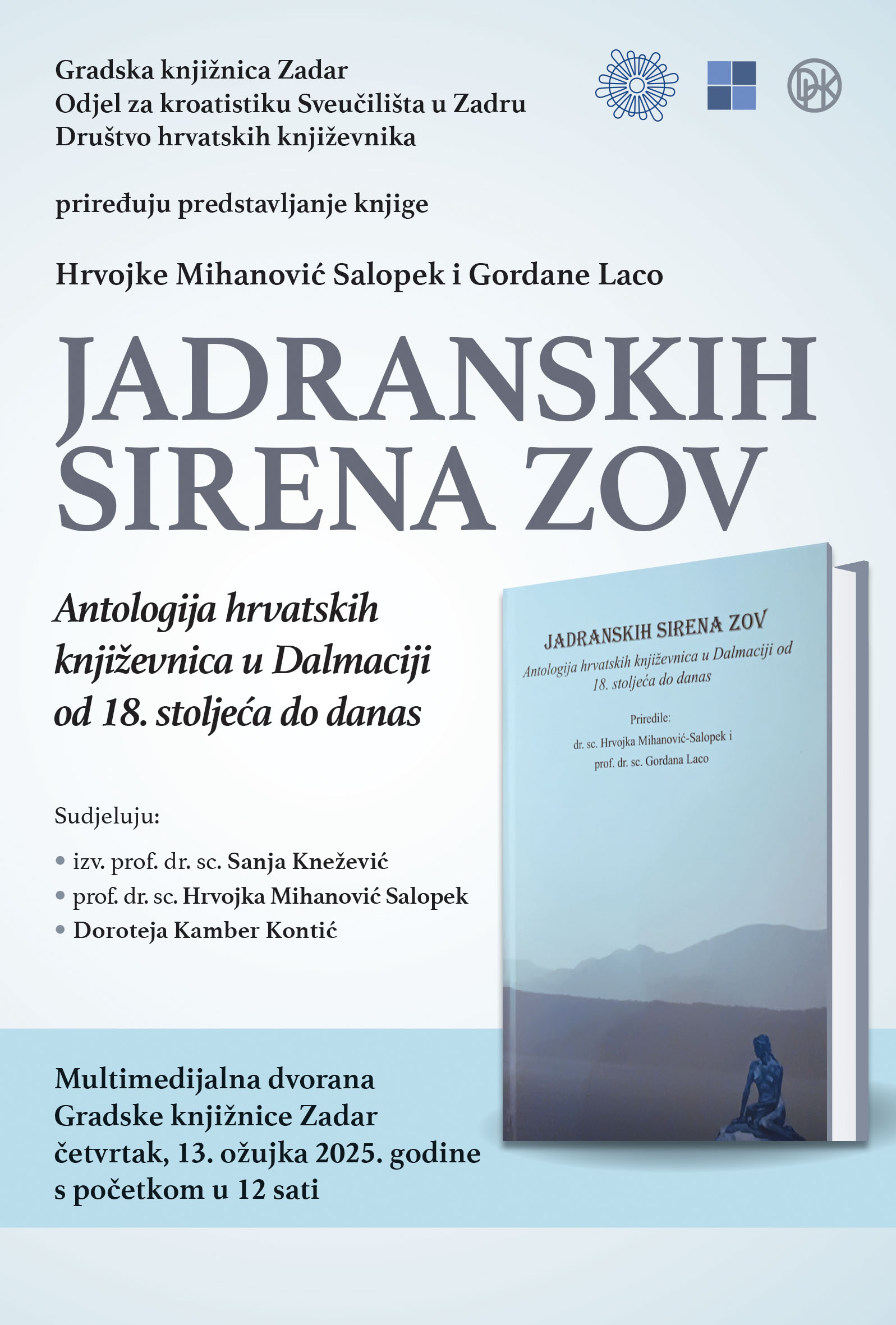 Gradska knjižnica Zadar, Odjel za kroatistiku Sveučilišta u Zadru i Društvo hrvatskih književnika priređuju predstavljanje knjige Hrvojke Mihanović Salopek i Gordane Laco: Jadranskih sirena zov: Antologija hrvatskih književnica u Dalmaciji od 18. stoljeća do danas koje će se održati u multimedijalnoj dvorani Gradske knjižnice Zadar u četvrtak, 13. ožujka 2025. u 12 h.
