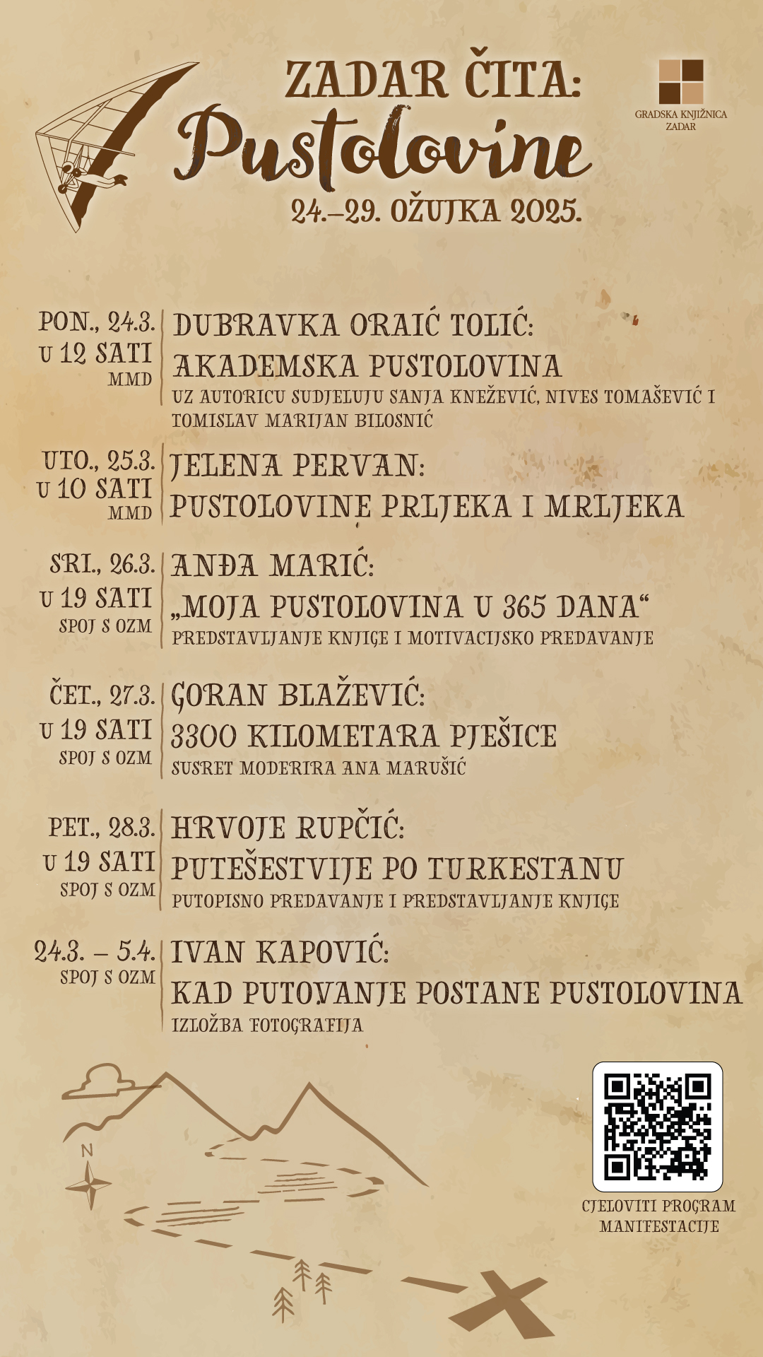 Zadar čita 2025. donosi preko stotinu različitih programa u organizaciji Gradske knjižnice Zadar i mnogih drugih institucija, škola, udruga i pojedinaca. Pustolovina kreće uskoro, a program se nalazi u privitcima.