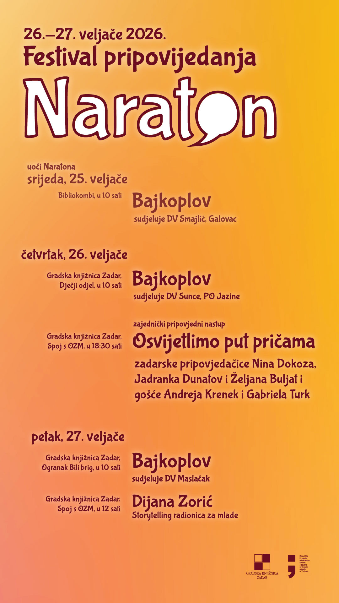 Festival pripovijedanja „Naraton“ održat će se 26. i 27. veljače 2026. godine u Gradskoj knjižnici Zadar.