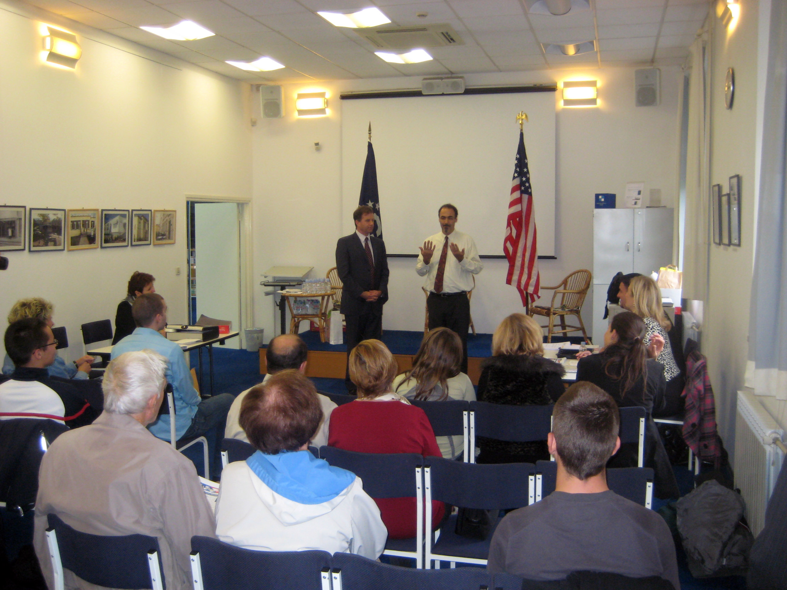 Konzularna služba za američke građane u Gradskoj knjižnici Zadar - Prilikom posjeta Zadru 20.10.2010., američki veleposlanik u Republici Hrvatskoj gosp. James B. Foley posjetio je Američki kutak i susreo se sa voditeljem kutka Milkom Belevskim i ravnateljem Gradske knjižnice Zadar Ivanom Peharom.